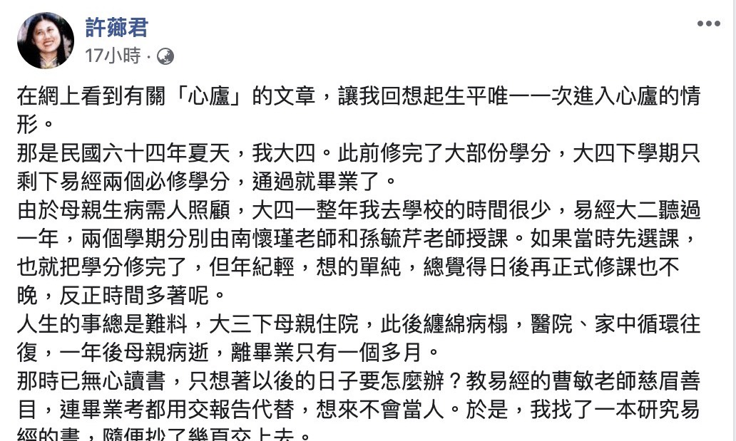 那時已無心讀書,只想著以後的日子要怎麼辦?教易經的曹敏老師慈眉善目,連畢業考都用交報告代替,想來不會當人。於是,我找了一本研究易經的書,隨便抄了幾頁交上去。
