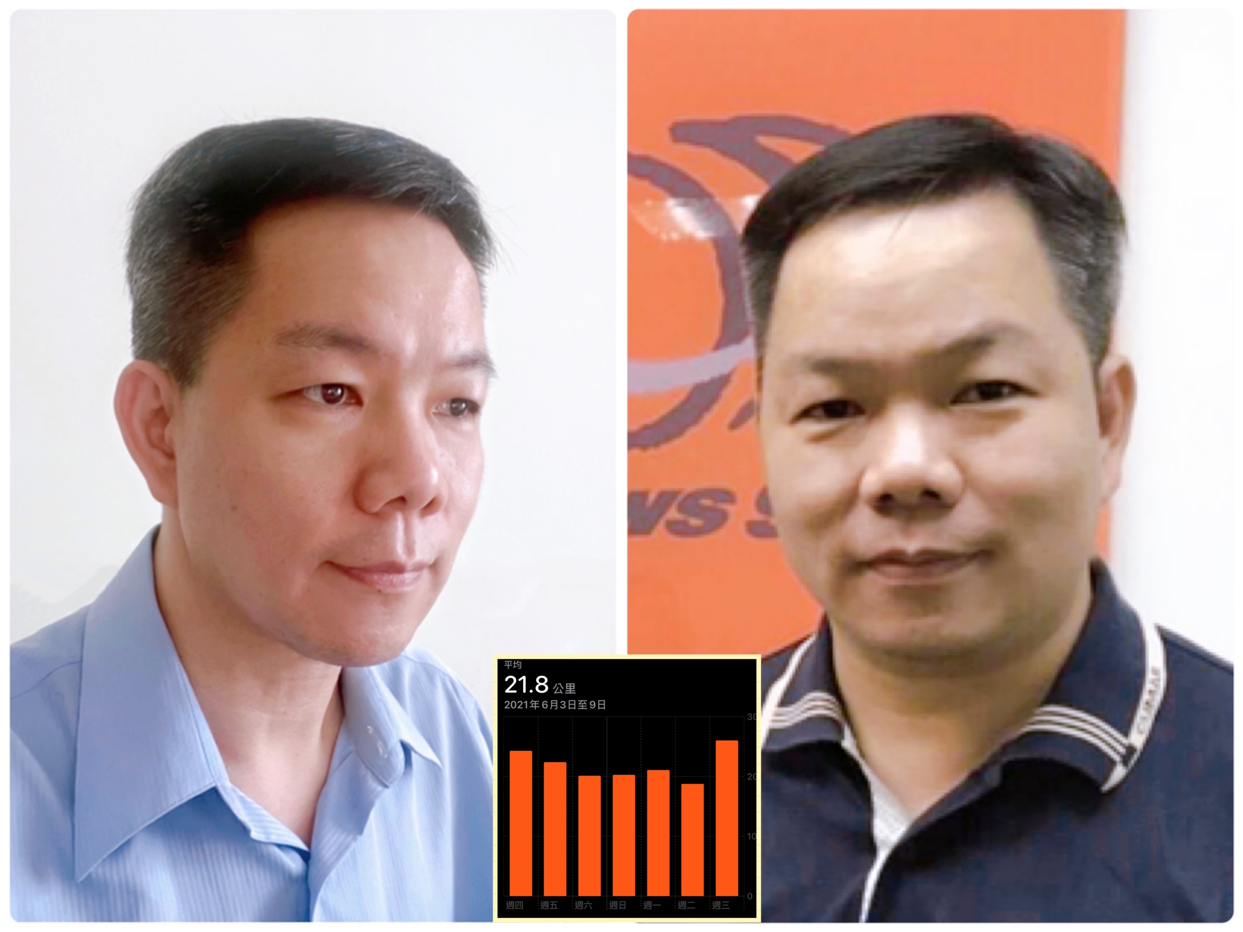 第五個月減重不多,賴祥蔚決定多跑一點,2021年五月平均每天超過15公里,6月初有一個禮拜平均每天21.8公里(見照片),最高紀錄一天跑26公里,6月中旬體重最輕時只剩61.4公斤,減重超過18公斤,目前則維持在63公斤。