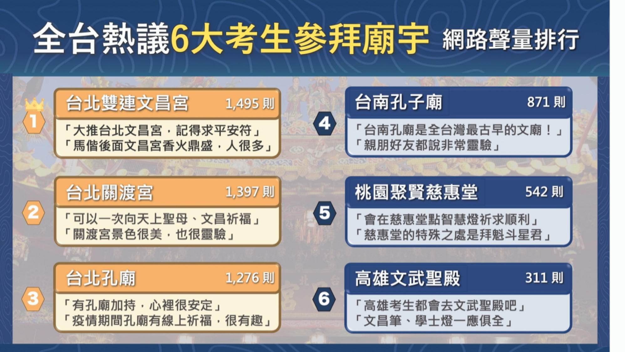 每逢大考將至,相信有許多考生與家長會造訪各地廟宇進行參拜,以祈求考試期間一切順利。觀察網路上對於「考生參拜廟宇」的討論,可以發現「台北雙連文昌宮」位居排行首位,由於鄰近捷運站交通便捷,且周邊又有市場與觀光景點,雙連文昌宮不僅吸引許多北部考生結伴前往,也是不少遊客的必經之處,有網友表示「過年過節都會到文昌宮祈福,小孩考試前也一定會去」、「文昌宮就在馬偕醫院旁邊,全年香火鼎盛」等,是北部頗具人氣的文廟。