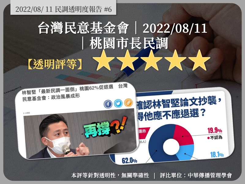 【愛傳媒特約記者吳思賢報導】針對台灣民意基金會2022年8月11 日發佈的桃園市長退選民調,「台灣民調透明百科計畫」評為5顆星。