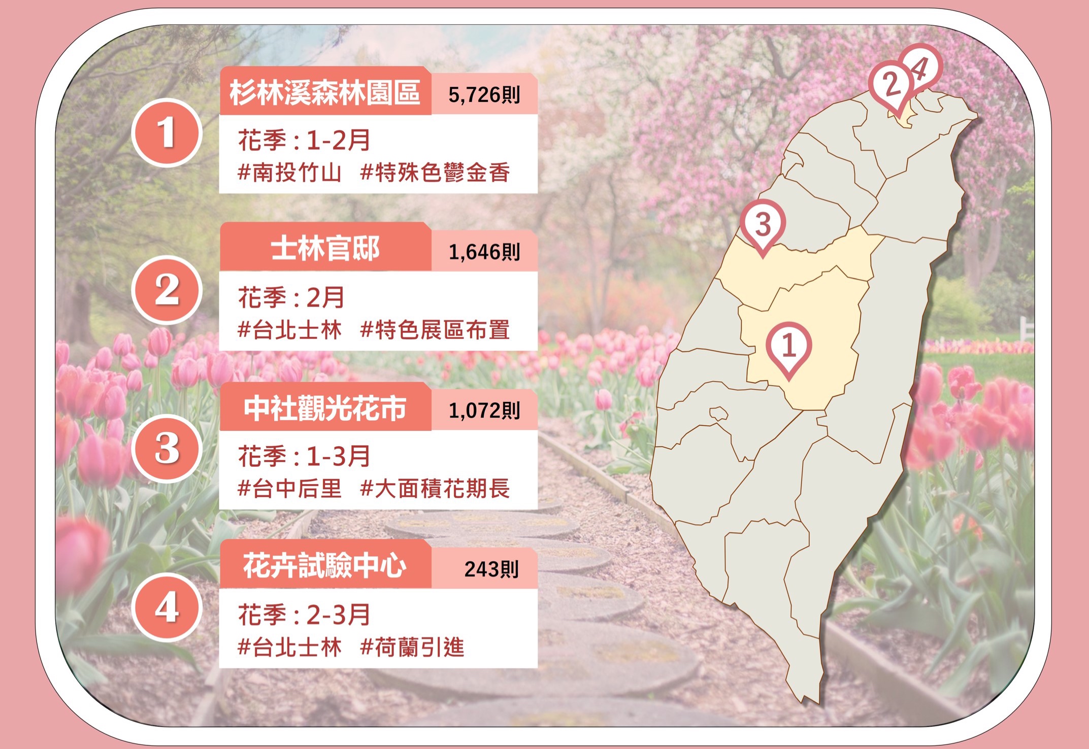 而「士林官邸」也是熱門景點之一,在每年2月份時會定期舉辦鬱金香花展,並設有與花展主題相符的佈置,2022年花展便配合主題「遇見幸福」設置「荷蘭童話故事村」、「灰姑娘的幸福邂逅」等區域,民眾看了直呼「好像來到童話世界!」、「怎麼拍都美,少女心大爆發」,不過也有網友說道「士林官邸人山人海,是不是台北人都跑來這裡賞花了?」,表示花季期間的人潮非常擁擠,可能會影響到賞花體驗。