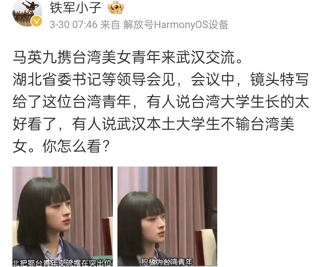 【愛傳媒特約記者陳冠宇報導】馬英九前總統前往中國大陸的祭祖之旅,持續引發國內、外各界的關注。有眼尖的電視媒體記者發現,馬前總統的青年團員中,有一位美女學生。湖北電視台在報導馬前總統的參訪活動時,特別給了這位美女台生十幾秒的超長特寫,頓時引發網路熱烈討論,對岸網友還掀起兩岸大學生誰比較美的話題(見照片截圖);台灣的TVBS、中天在後續報導馬前總統會見湖南省委書記沈曉明的報導也跟進,鏡頭帶到這位青年美女團員時特別給予關注。