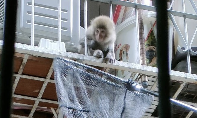 板橋區漢生東路民眾李小姐表示,忽見住家巷弄有幼猴出現,因巷弄狹窄且充斥排油煙管熱水管,擔心牠在其間穿梭容易受傷,因此趕緊通報動保處救援。動保員起先以新鮮水果裝在籃內靠近幼猴,不過牠似乎不感興趣,只好往下與低樓層住戶溝通嘗試靠近幼猴,對於人類靠近幼猴不害怕,但牠所在位置懸空巷弄間,貿然抓捕稍有不慎人猴都可能受傷。