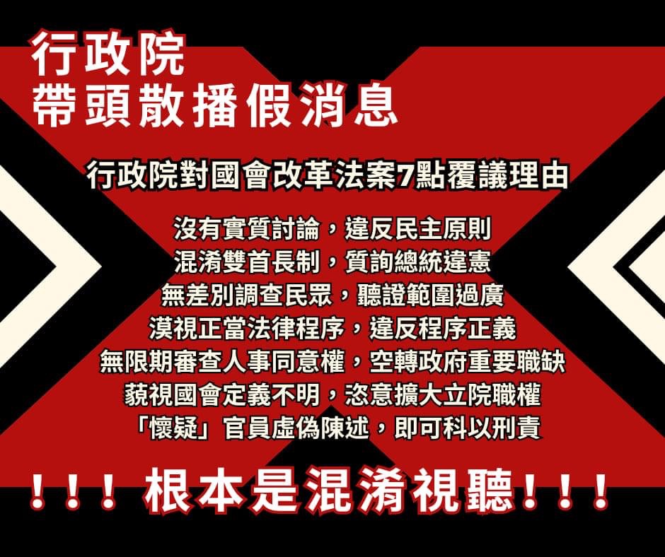1.國會改革修法程序全程合法、符合民主原則與正當法律程序:國會改革修法歷程完全符合立法院職權行使法、立法院議事規則,也經過實質討論與合法表決。更何況「立法程序」與行政院職權無關,立法程序如何都不會讓行政院「窒礙難行」。
