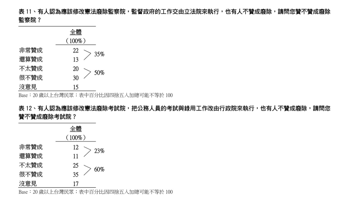 除了詢問立委表現與政黨形象外,題目亦詢問民眾對於「廢除考試院、監察院」的看法。完整題目如下: