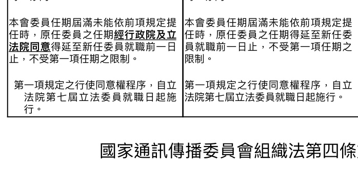 葉元之委員提出的修法版本言簡意賅,把「本會委員任期屆滿未能依前項規定提任時,原任委員之任期得延至新任委員就職前一日止,不受第一項任期之限制。」加了10個字,增加民意把關,變成「本會委員任期屆滿未能依前項規定提任時,原任委員之任期經行政院及立法院同意得延至新任委員就職前一日止,不受第一項任期之限制。」