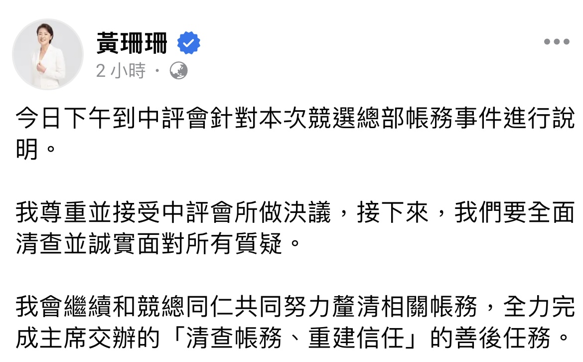 針對民眾黨中評會做出將中央委員、立法院黨團副總召等職務全部停職。黃珊珊表示,接受中評會所做決議,接下來要全面清查,誠實面對所有質疑,繼續釐清相關帳務。