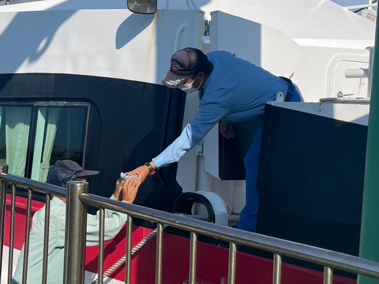來自新莊的台灣女遊客萬分焦急,好不容易半個小時之後遊船回來,她親眼看到岸上的工作人員一等遊船接近,就立刻伸出雙手接過她的小寵物,非常細心,讓人感動。
