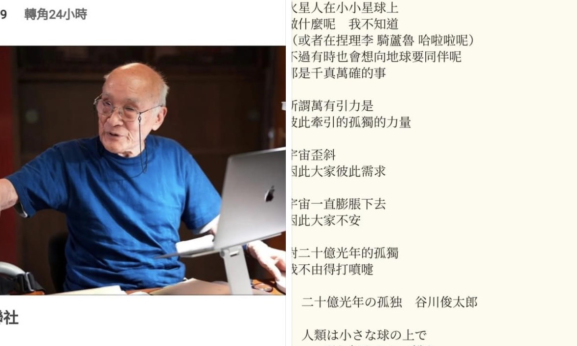 【聚傳媒蔡詩萍專欄】日本知名大詩人谷川俊太郎走了,享年92歲。