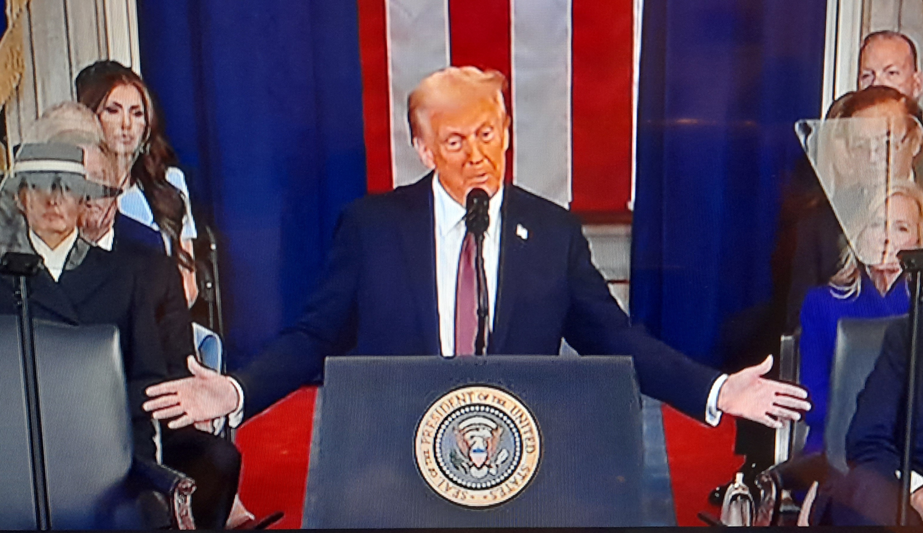 川普說,謝謝,非常感謝大家。副總統萬斯、議長詹森、參議員圖恩、首席大法官羅伯茨、美國最高法院大法官們、總統克林頓、總統布希、總統奧巴馬、總統拜登、副總統哈裡斯,我的美國同胞們。