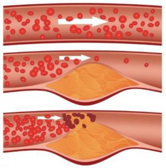 圖/上方血管中膽固醇(或脂質斑塊)累積的「血管壁剖面圖」;中間為血管在斑塊累積的情況下,血管腔(lumen)明顯變窄,血流受阻;下方為胆固醇、脂質及其他物質初期沉積於血管內膜‑中膜之間,引起血管壁增厚。(圖為AI製圖)