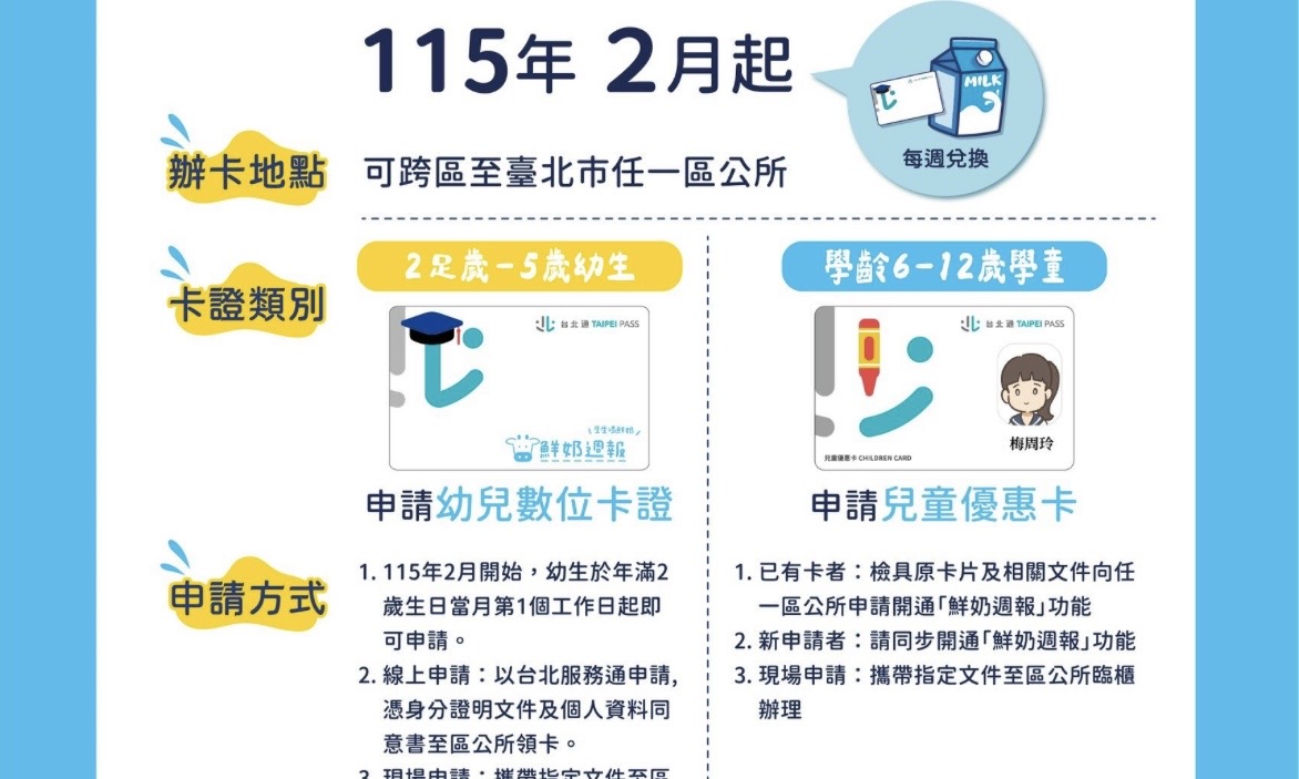 【聚傳媒特約記者陳欣如報導】臺北市政府教育局宣布,「鮮奶週報—生生喝鮮奶」政策自115年2月起放寬申請條件,補助對象向下延伸至「生理年齡」滿2歲的幼兒。只要設籍臺北市,不論是否就讀幼兒園,只要滿2足歲當月,即可申請幼兒數位卡證,每週兌換一瓶鮮奶或豆漿,提前為孩子的成長補足關鍵營養。