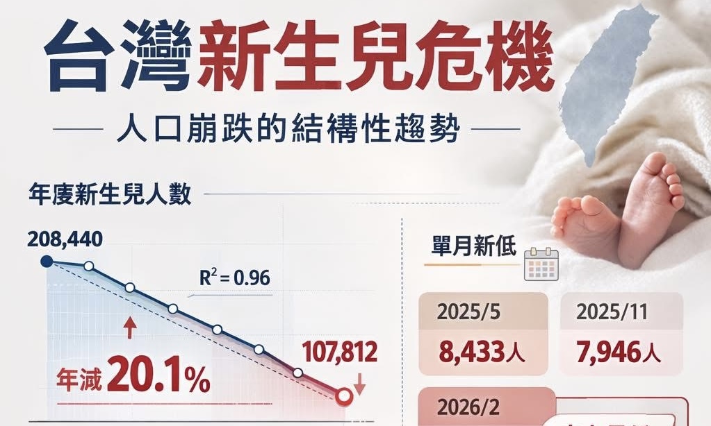 【聚論壇杜聖聰專欄】2026年3月,內政部公布了一組震驚輿論的數字:2月份全國新生兒僅6,523人,首度跌破7,000人大關,創下台灣有史以來單月出生人數的最低紀錄。這個數字不是偶發的統計異常,而是一條長達十年、斜率持續向下的趨勢線上,最新出現的一個觸目驚心的標記點。