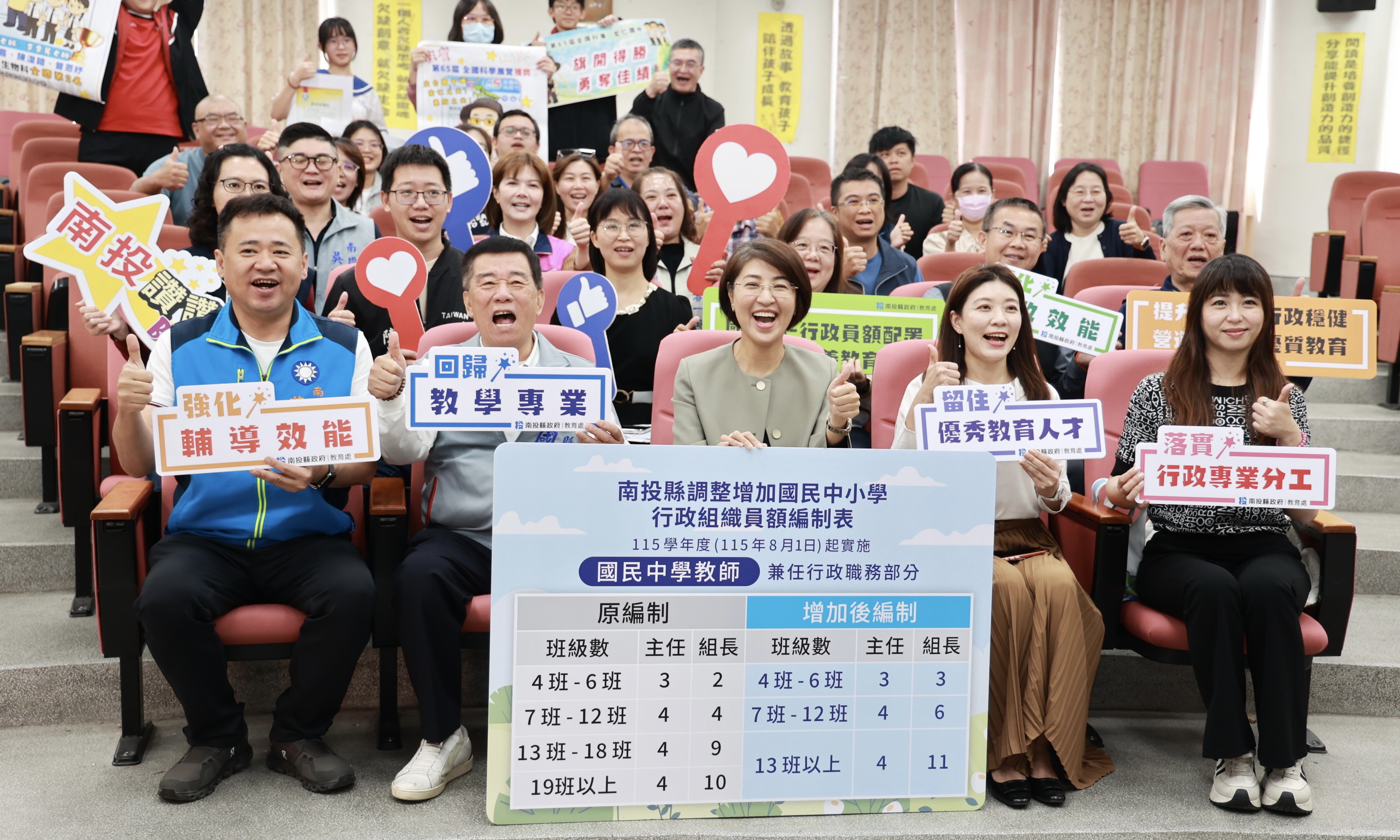 【聚傳媒特約記者陳欣如報導】南投縣長許淑華18日宣布一項重大教育政策,自115學年度(即8月1日起)起,擴大國中小學行政人員編制,預計每年增加約2,372萬元支出。這項措施將減輕教師兼任行政工作壓力,也讓教育回歸教學本質。