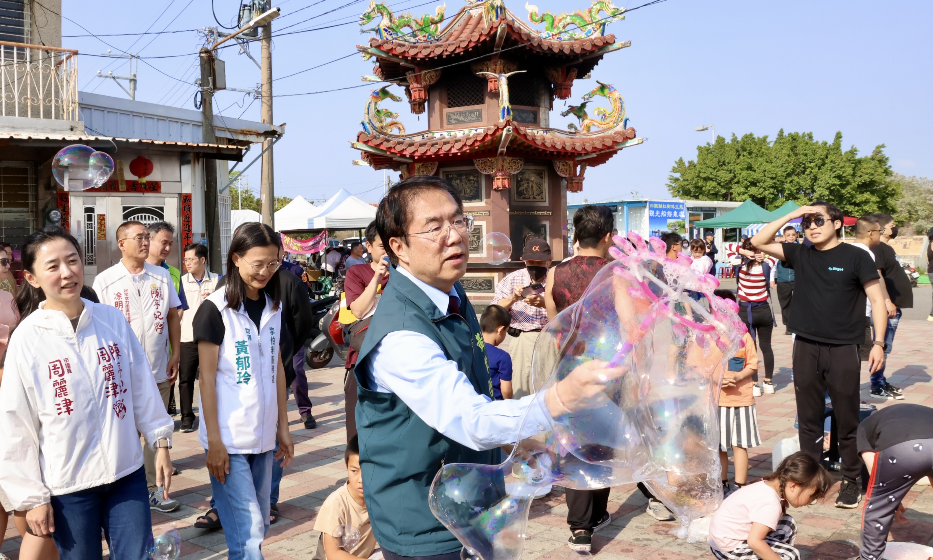 活動期間,龍山寺前廣場化身為多元展演舞台,安排「魔幻泡泡秀」、「紙王船手作體驗」、「松斗林陶藝彩繪」、「鯤鯓尋秘定向越野」、「社區特色手作」及「馬匹騎乘體驗」等豐富內容,兼具文化意涵與親子互動樂趣;另有學校團隊與街頭藝人輪番演出,並結合歹銅古社與農特產市集展售,全面展現濱海社區的創意能量與產業特色。