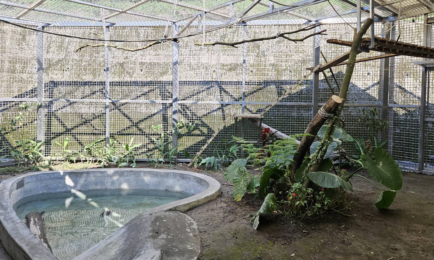 三芝動物之家鄰近山海環境,野生動物救援需求高。動保處因應地緣特性,將場域規劃為低干擾、具減壓效果、還原自然棲息環境的復原空間。救傷中心設有野生動物專用配膳室、醫療室,其籠舍採滑輪與拉軌設計,可彈性調整空間配置,並有效區隔人員與動物,兼顧安全與照養需求;收容對象涵蓋哺乳類、猛禽及兩棲爬蟲類等物種,並依物種特性打造模擬自然環境。小型哺乳動物設置空中廊道,模擬野外棲地供其攀爬活動;室內外欄舍亦設置多樣棲架與環境豐富化設施,戶外區更設有兩棲爬蟲類水池及多樣化棲架,透過專業規劃、有效減輕動物緊迫感,提升整體救傷復原環境。