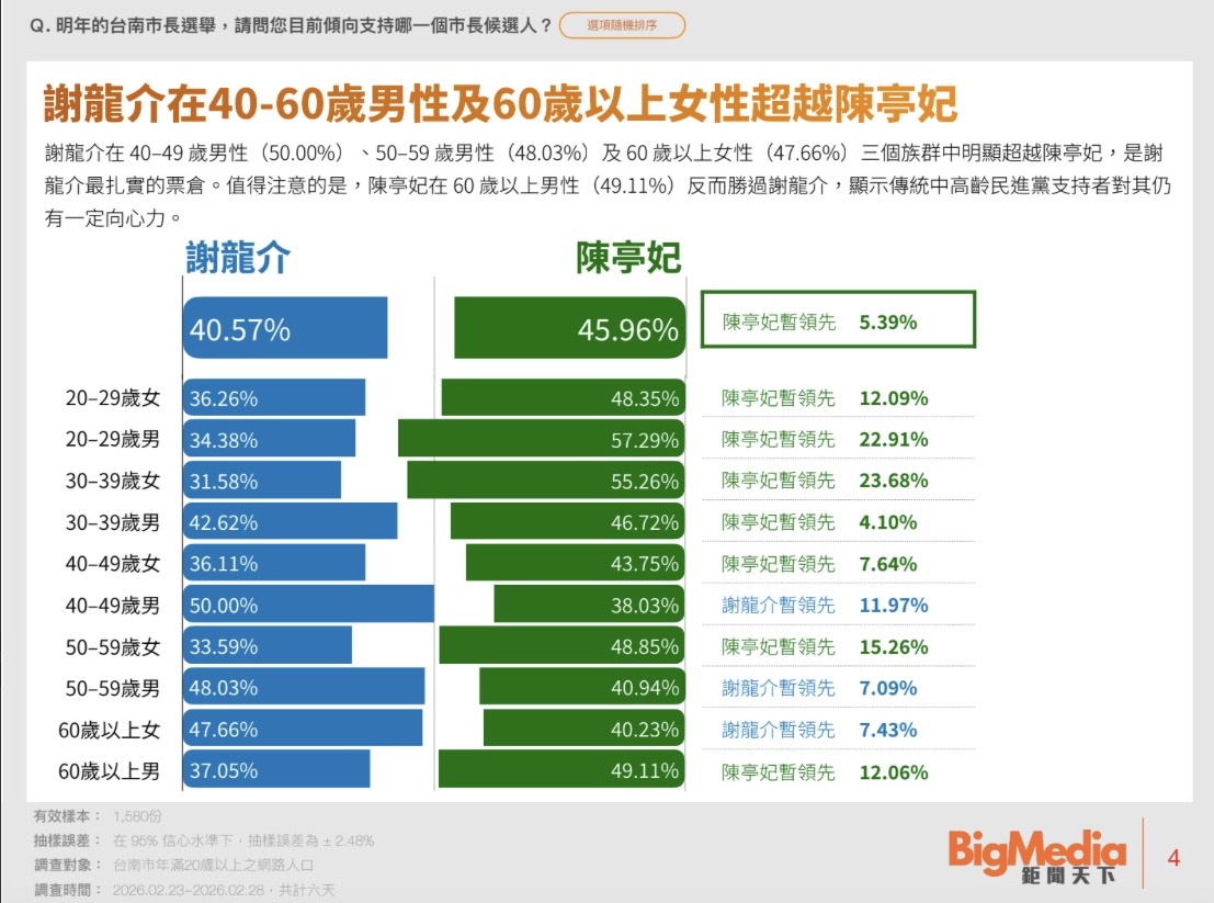 照片為民調報告截圖 【聚傳媒特約記者陳冠宇報導】最近半個月有兩份台南市長民調公布,陳亭妃與謝龍介兩人的支持度落差高達18%,民調結果差那麼多引發討論。 台南市長選舉民調的大幅落差不是新聞,回顧2022年選舉時,《美麗島電子報》的選前民調,謝龍介輸給黃偉哲高達45%,選舉結果卻只差了5%。 《鉅聞天下新聞網》3月公布台南市長民調,民進黨陳亭妃支持度45.96%,小幅領先國民黨謝龍介的40.57%,差距5.39個百分點。才過了不到10天,3月16日,《TVBS》民意調查中心也發布民調顯示,陳亭妃支持度達53%,領先謝龍介的30%,雙方差距多達23個百分點。 這兩份民調發表時間相隔不到半個月,陳亭妃與謝龍介得到的支持度卻有18%的差距,引發政壇很多討論,到底要相信誰的民調? 謝龍介在2022年首次參選台南市長,民調比今年更不看好,平均落後三成,甚至到了要投票的11月,還有民調做出他輸45%,最終只以5%小敗。 謝龍介自己解讀這不難理解,因為台南市在民進黨長期執政下,國民黨支持者被訪問時,會偏隱性,支持率普遍被低估。此外,TVBS這回公布的民調,是用全市話調查,青壯年與年輕人的比例會偏低,而這些族群都支持政黨輪替、換人做看看,這也就是為何半個月前,《鉅聞天下新聞網》公布的網路民調,他和對手就只差5%。 兩份民調的調查方式與時間不同,提的問題也不同,落差在所難免;況且,媒體做候選人民調支持度差那麼多,台南也不是第一次。 回顧2022年台南市長選舉,選前共有6份媒體民調公布,黃謝兩位候選人最大的落差有差45.4%,最小的才差了7.17%。 2022年,黃偉哲當選得票率48.8%,輸的謝龍介43.63%,兩人差5.17%。但選前五個月到前一個月,媒體陸續公布民調,落差最小的是當年《菱傳媒》委託皮爾森數據公司做的網路民調,相差7.17%(黃偉哲44%,謝龍介則是36.83%)。《TVBS》在2022年7月也曾做過民調,雙方差距19%(黃50%、謝31%);落差最大的是《美麗島電子報》,雙方差了45.4%(黃61.1%、謝15.7%);其他媒體公布的民調差距,《蓋洛普》差31.1%、《自由時報》差30%、《ETTODAY》差19.6%。 《菱傳媒》與《鉅聞天下新聞網》所委託的民調公司都是皮爾森,都是做網路民調,但《TVBS》則是透過電話做民調,這是這次台南市長民調雙方最大不同。但結論也很殘酷,當時網路媒體《菱傳媒》的民調,比老牌的《TVBS》要準確。 根據《TVBS》發表的新聞,這次民調「由TVBS民意調查中心於115年3月9日至12日晚間18:30至22:00進行,調查採用市內電話號碼後四碼電腦隨機抽樣,並由人員進行電話訪問,調查共成功訪問有效樣本1,052位20歲以上台南市民,在95%的信心水準下,抽樣誤差為正負3.0個百分點以內,所有資料均依母體性別、年齡、地區、教育程度等變項進行統計加權處理,調查經費來源為《TVBS》」。 《鉅聞天下》的新聞稿則說:「本次調查是由《鉅聞天下》委託,皮爾森數據負責執行,經費來源為《鉅聞天下新聞網》。針對台南市年滿20歲以上之網路人口,從2026年2月23日至2026年2月28日,共計進行6天,當中有效樣本為1,580份,在95%信心水準下,抽樣誤差為正負2.48%以內」。 因為網路民調在台灣還沒有很盛行,皮爾森數據公司還特別說明:「抽樣方法採用網路主動發放調查方式,透過資料管理平台(DMP),在性別、年齡與居住地比例分層隨機抽樣進行調查,並輔以網路行為分析帶入使用者輪廓標籤,確保符合調查對象的唯一性。同時針對使用者的性別、年齡與居住地的準確性採用網路行為與資料庫標籤比對方式,結合問卷題目設計做雙重認證,確保資料正確性與可靠性。透過轉傳分享問卷、重複填答,以及各種不符合隨機抽樣條件之樣本,皆不屬於有效樣本。樣本代表性與加權則採用比率估計法,母群體參數依內政部公布2026年1月民眾年齡、性別、戶籍資料,結合皮爾森數據DMP修正網路人口特徵值,逐項重複進行連續性修正,以使樣本特徵與母群體結構達到一致」。 事實上,網路民調在國外已經很多人採用,台灣則很少。2021年起,《菱傳媒》與皮爾森合作開始做網路民調,近4年來發表過總統、縣市長、市議員,甚至政策民調,因為民調與選舉結果很接近,得到不少肯定。《菱傳媒》於2022年10月26日發布的台南市長民調,「民調透明百科計畫」還曾給予27分及四顆星評等。這代表這份民調在民調基本資訊、調查方法與交叉分析方面,能達成透明揭露的基本要求。 台大還曾做過科學性調查,肯定了皮爾森的網路調查方式。 2024年8月台大網路調查研究中心,與四家民調機構執行7樣平行調查,分別用5種不同抽樣方式,包括電話、手機、簡訊、混合模式網路樣本,及皮爾森網路調查方法。這項調查的綜合結論說,皮爾森數據網路調查,在多項關鍵指標上表現優異,特別是在地理代表性、區域層級抽樣精確度上。
