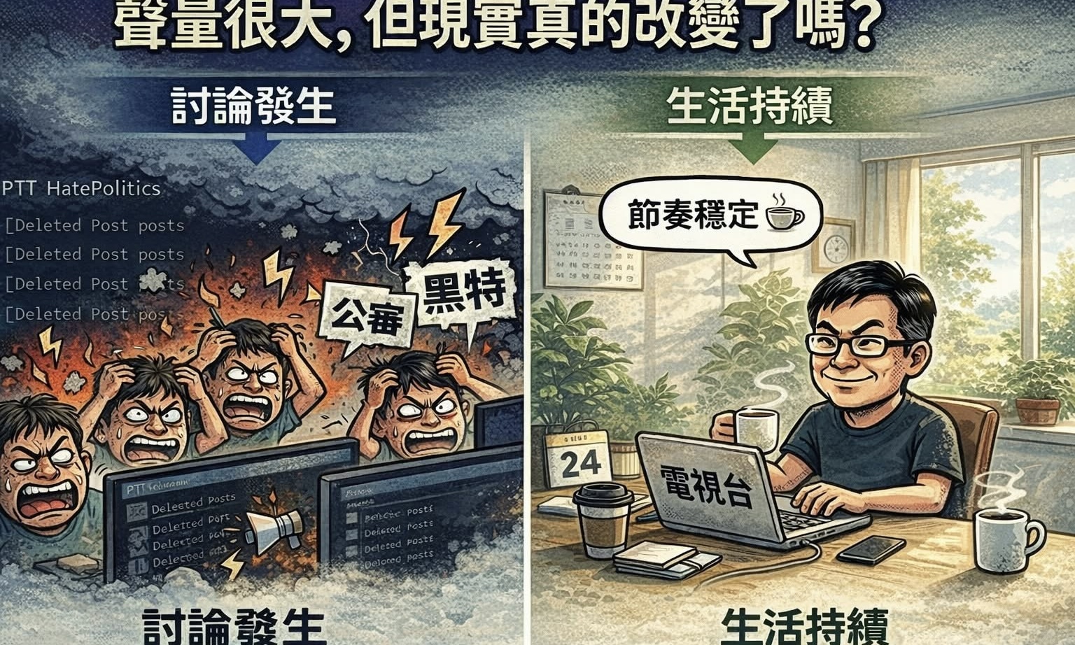 照片為作者提供 【聚論壇楊秉儒專欄】自從被2015年滅慈風暴的無明風捲回網路論壇這個修羅道場,這近十年來,我對「聲量」這件事,有一些比較實際的體會。 有時候在網路上看到關於自己的討論,會發現那個世界,和現實生活,其實是兩條不同的軌道。 有一段時間,討論很多、聲量很高,各種分析、推測、拼湊,也都很用力。 站在當事人的角度,其實感受是有的,但更多時候,是一種「距離感」。 因為你會很清楚地看到 討論在發生 生活也在繼續 兩件事情同時存在,但不一定交會。 這一年下來,我反而更明確地感受到一件事:很多人會把「被討論」和「被影響」畫上等號,但實際上,兩者之間並不一定有直接關係。 工作的節奏,還是照既有的制度在走;日常生活,也不太會因為留言而改變。 聲量可以很高,但它不一定會轉化成現實層面的改變。 這並不是在否定討論的價值。 討論本身當然有意義,不同的觀點也有其存在的空間。 只是當你身在其中,時間拉長之後,會慢慢意識到一個比較現實的狀況: 討論的影響力,和實際生活的運作,常常是分開的。 對我來說,比較重要的反而變成: 在各種聲音之中, 怎麼維持自己的節奏,繼續把該做的事情做好。 因為不管外界如何變化,工作還是要完成,生活還是要過。 如果這段時間有什麼體會,大概就是:不是所有的聲量,都會留下痕跡;也不是所有的關注,都會改變現實。 有些東西,存在於討論之中;但生活,會按照它自己的方式繼續前進。 所以到最後,事情其實會回到一個很簡單的問題:在這些聲音之外,自己選擇把時間和精力放在哪裡。 生活還是照常運作。 該上班的上班,該做的事情繼續做。 到頭來,節奏穩定,比什麼都重要。 作者為資深媒體人 ●專欄文章,不代表J-Media 聚傳媒立場。