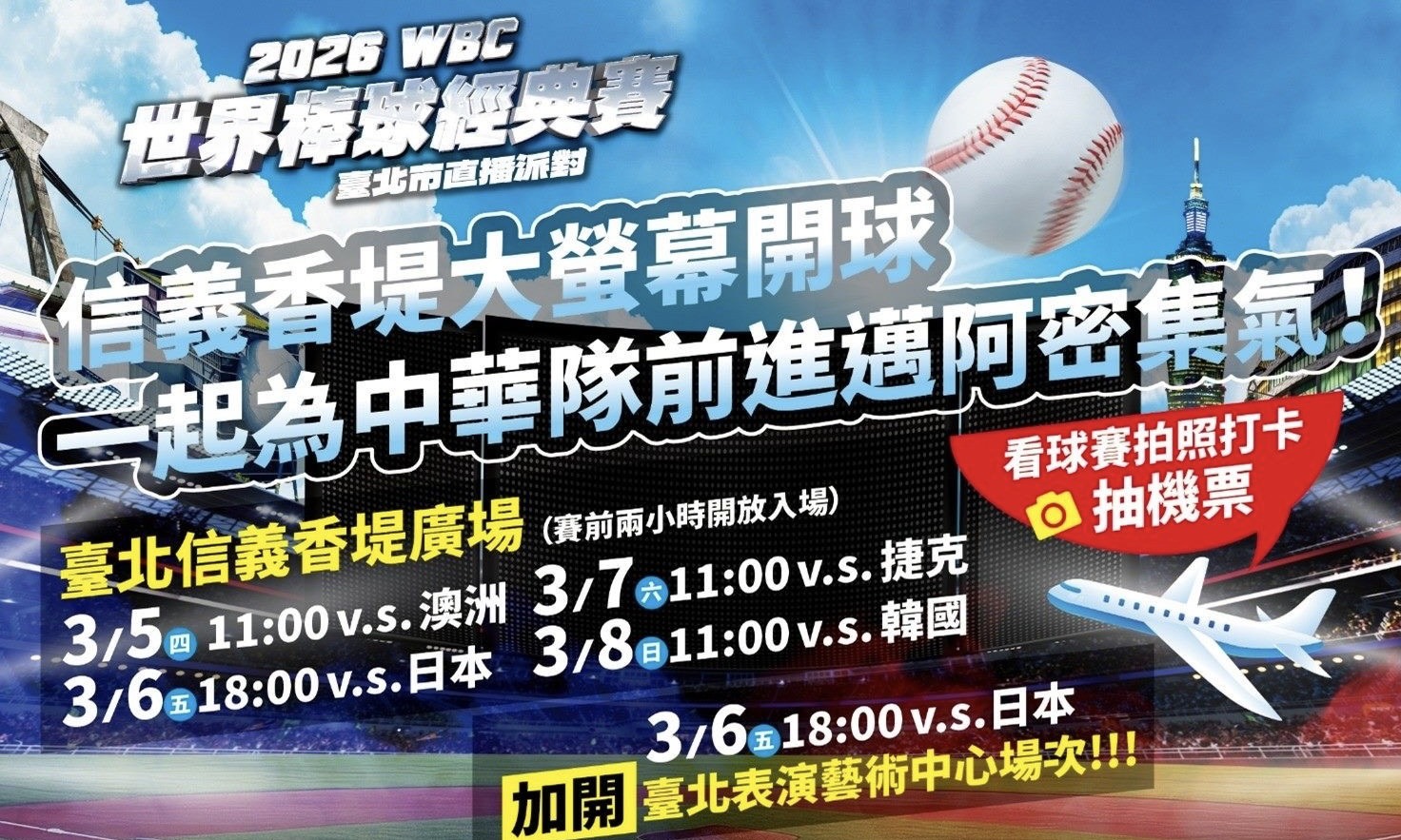 照片取自臺北市政府 【聚傳媒特約記者陳欣如報導】「2026第六屆世界棒球經典賽(WBC)」即將於臺灣時間3月5日(四)點燃戰火,中華隊在東京巨蛋C組預賽將接連迎戰澳洲、日本、捷克及韓國,爭取晉級邁阿密淘汰賽舞台。臺北市政府體育局宣布,將於3月5日至8日在信義香堤廣場舉辦戶外直播派對,號召全體市民化吶喊為能量,助中華隊衝破重圍、邁向邁阿密決賽舞台。 體育局表示,本次直播派對以「城市即主場」為核心概念,打造全城應援的集結場域,特別選定人潮匯聚的信義香堤廣場作為主場基地;針對3月6日(五)晚間6點備受矚目的「台日經典對決」,更特別加開臺北表演藝術中心轉播場次,串聯東區潮流與北區藝文雙主場。此外,南港中信金融園區也將同步於3月6日至8日舉辦直播活動,透過三區連動讓熱血應援能量擴散至整座城市。現場將架設400吋LED超大螢幕,結合高規格音響設備與DJ音控,營造不輸東京巨蛋現場的臨場震撼。 為展現城市棒球的深厚底蘊與生命力,3月6日(五)也特別邀請曾多次代表我國征戰國際賽的臺北市長安國中棒球隊,與市民共同參與國旗歌領唱環節,象徵臺灣棒球精神的世代傳承。此外,人氣啦啦隊「小龍女」也將親臨現場,帶領球迷用整齊一致的律動與吶喊點燃臺北,將每一份支持轉化為中華隊征戰賽場的最強能量。 除賽事轉播外,現場更準備了豐富的回饋活動。每場次將發放限量800份的應援拍拍扇、小國旗及紋身貼紙,並設有Kahoot棒球知識互動遊戲及主題拍照區。參與活動更有機會抽中長榮航空來回機票及BOSE品牌音響等多項好禮,讓球迷不僅觀賽過癮,還能把驚喜帶回家。