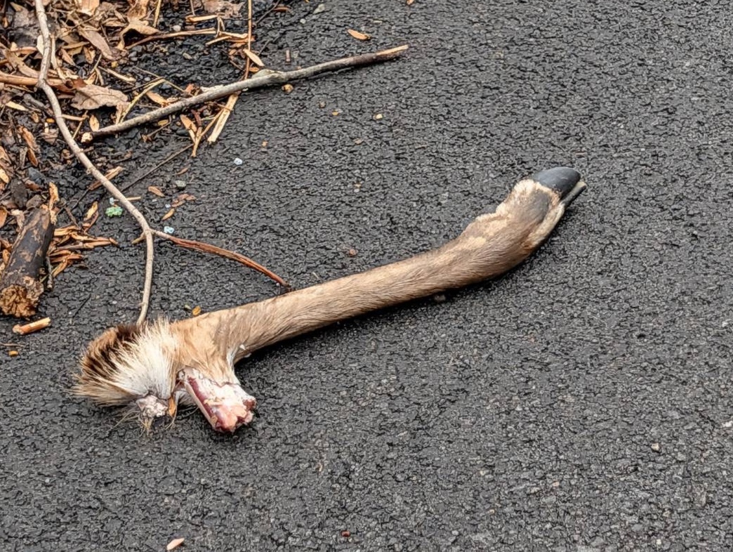 照片為魏慧美拍攝提供 【聚傳媒特約記者賴御文報導】近日紐約州的路上出現一處令人毛骨悚然的景象:在道路上居然出現一截斷肢屍塊,疑似是鹿隻的殘肢。目睹的居民魏慧美第一時間懷疑是否為美洲黑熊所為。這起事件發生在下午五時後,路經現場看到原以為是樹枝,仔細一看才發現是斷肢。 附近居民表示,一般這時候,路上常會看到被車撞死的整隻死鹿,這種「零售」的還真是第一次看到。居民推測,兇手或許是附近出沒的黑熊,但是沒有證據,而且再想一想又覺得野鹿的奔跑速度過快,不太可能被熊成功捕殺。 已經在紐約州當地居住20多年的居民表示,以前都覺得住在那裡安全沒有問題,但看到斷肢之後有點擔心了。 居民事後跟家人討論,由於現場沒有血跡,斷肢也相當乾淨,得到一個可能的推論:附近正值狩獵季,可能有獵人捕獵鹿隻之後不慎遺留,也可能是獵人只取走肉質良好的部分,將剩餘比較沒有肉的殘肢留在林間,留給狐狸、郊狼甚至熊等食肉動物。 事發不久之後,該處斷肢已經消失,不知道是獵人取走或是被野生動物叼走,現場已無殘留。