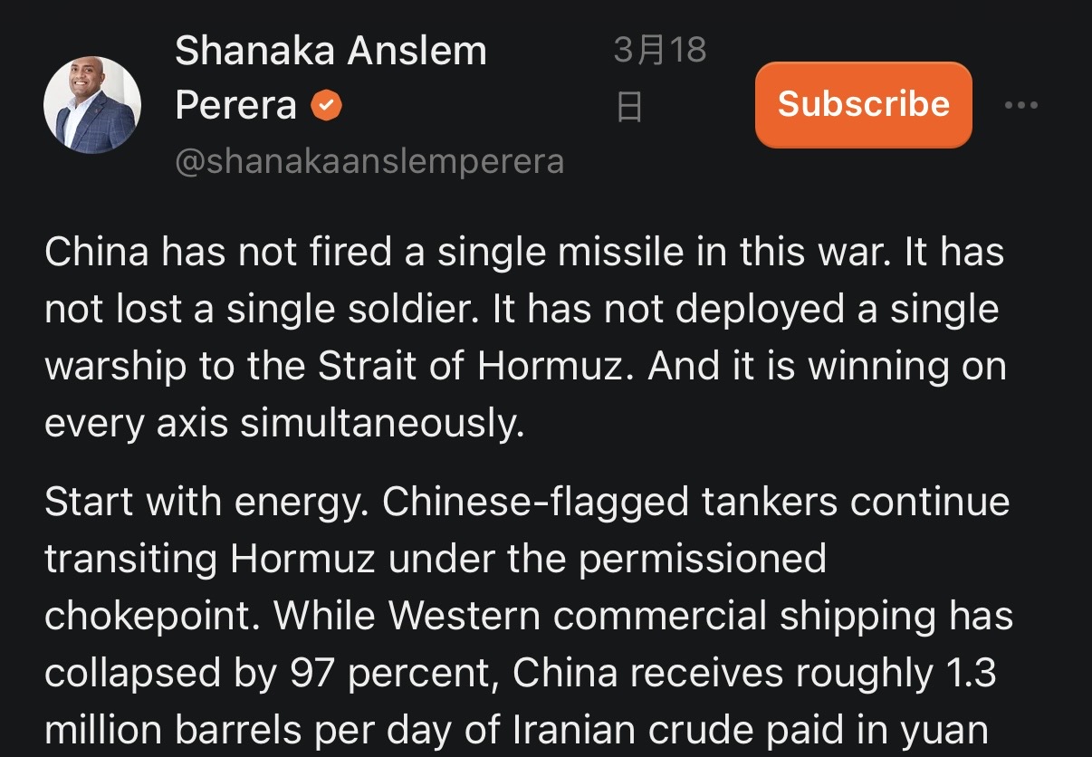 照片為Perera網頁截圖 【聚傳媒特約記者陳冠宇編譯】美國與以色列攻打伊朗,伊朗為了報復而封鎖荷莫茲海峽。國際知名的分析師Perera指出,最大贏家是中國。 根據知名的國際政經分析師、獨立研究者Shanaka Anslem Perera的分析,中國在這場中東戰爭中,一發飛彈未發,一兵一卒未損,沒有派遣任何一艘軍艦前往荷莫茲海峽,卻在每個層面都迅速獲得了勝利。 掛中國國旗的油輪持續在荷莫茲海峽航道獲得放行。西方商船運量暴跌97%,中國每天透過此管道獲取約130萬桶伊朗原油。 Perera指出,中國人民解放軍正觀察這二十多年來,最鮮活詳盡的美國軍事實力實況展示:高超音速攔截彈性能、薩德反導系統攔截範圍、死神無人機弱點參數、電子戰反制措施、F-35出動率。一家中國企業聲稱已偵測到B-2隱形轟炸機輻射特徵,以及航母長期部署下的續航極限。解放軍原本可能需要十年的間諜活動才能取得的各項數據,都透過這場中國既未發動、也未資助、更沒有參與的戰爭,呈現在自己的眼前。 至於供應鏈,中國掌控全球超過90%的稀土加工能力。這場戰爭以史無前例的速度消耗著精確制導彈藥、5000磅地堡炸彈、薩德攔截彈、愛國者飛彈。這些玩意兒的導引系統、馬達與電子設備全都仰賴稀土元素。每一枚射向伊朗的飛彈,都在消耗庫存,補充這些庫存取決於中國的稀土加工。北京在2025年已禁止或限制稀土出口。被耗盡的軍火庫,以及用於補充的供應鏈,全都由中國的決策把關。 Perera近一步分析糧食領域:中國已暫停磷酸鹽出口至2026年8月,並停止氮磷鉀複合肥料運輸。印度於3月12日向北京緊急求援尿素,遭到拒絕。 中國一方面透過獲准通行的海峽成為伊朗原油最大買家,一方面又對全球其他地區種植所需的肥料原料實施最嚴格的出口限制。中國以低價取得能源,卻掐住競爭對手的肥料供應。 Perera認為,除中國以外,各國的糧食危機很可能會持續加劇。 最後是金融層面。據Chainanalysis估計,俄羅斯的A7A5穩定幣處理金額介於560億至930億美元之間,其運行架構與中國推動的跨境支付計畫相呼應。每一項對SWIFT的限制、每一條規避制裁的管道、每一條支撐伊朗與俄羅斯挺過戰爭的加密貨幣通道,都在驗證北京佈局十年的非美元結算系統的可行性。 Perera強調,美國耗費165億美元、發動15000次精確打擊,只為阻止伊朗研製十枚核彈。中國未花一分錢,卻收穫實戰情報大禮、低價能源、對半數開發中國家的肥料掌控權,並對未來可能會面對的美製武器系統,完成了一場實彈壓力測試。這場戰爭有眾多輸家,只有中國這位沉默的贏家。